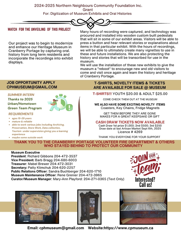 The museum has a wall of Family History booklets completed by many of the Cranberry Portage families and these are very popular to visitors. If you have not submitted yours, Family History Questionnaires are available from the Museum.